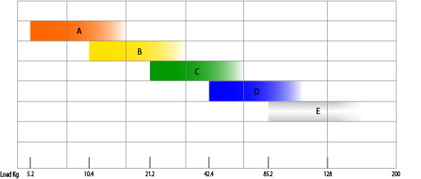 We suggest, for reasons of ease of set-up and loads that are not equally distributed, that consumers always select the stronger Load Cell where two values overlap in the graph below.